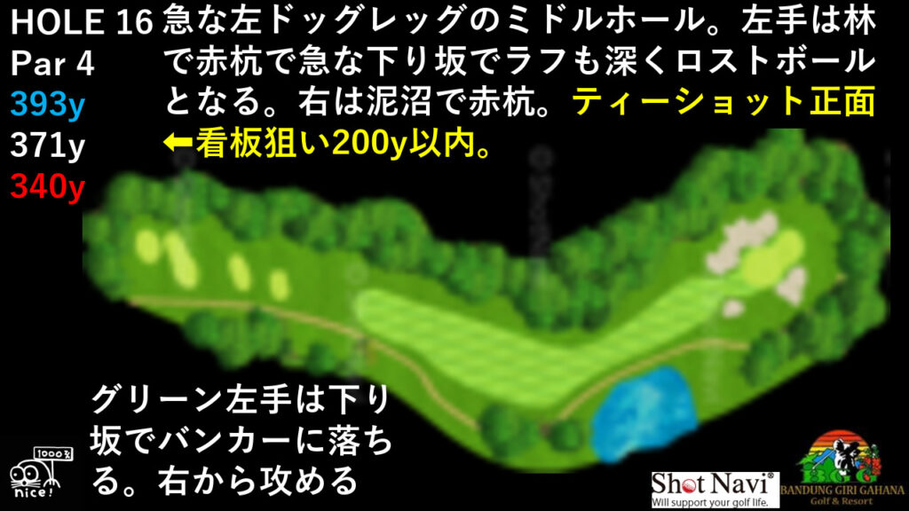 左ドッグレッグのミドルホール。正面突き抜けると泥沼が待ち構える。ティーショットは正面の「⬅」看板狙い200y以内。